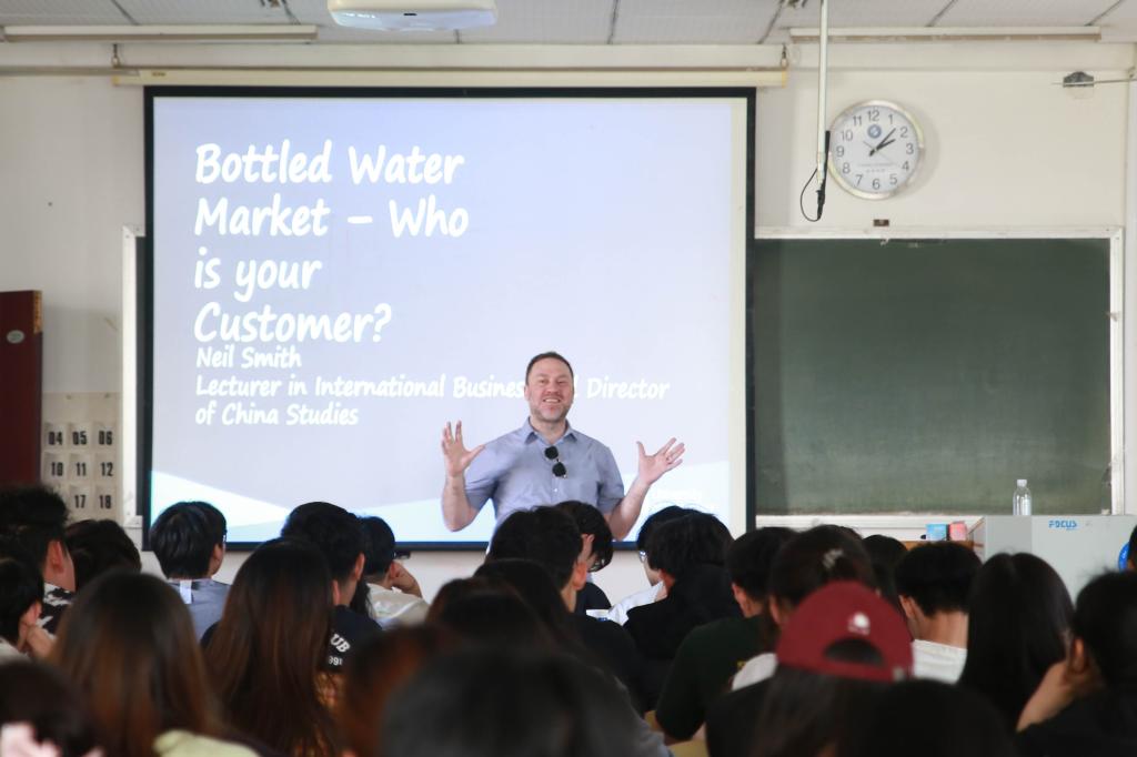 互動環(huán)節(jié),Neil Smith以沉浸式課堂解鎖商業(yè)奧秘。以“水”為媒演繹同質(zhì)產(chǎn)品競爭策略。他將三款不同品牌、價(jià)位的水呈現(xiàn)在課堂,邀請同學(xué)們通過觀察以及品嘗口感差異,對三款水進(jìn)行價(jià)格排序。同學(xué)們踴躍參與,現(xiàn)場氣氛持續(xù)高漲。老師采用“理論+實(shí)踐”雙軌教學(xué)模式,通過具象化的案例拆解,讓晦澀的理論知識直觀展現(xiàn),生動詮釋了消費(fèi)者決策背后的深層邏輯。