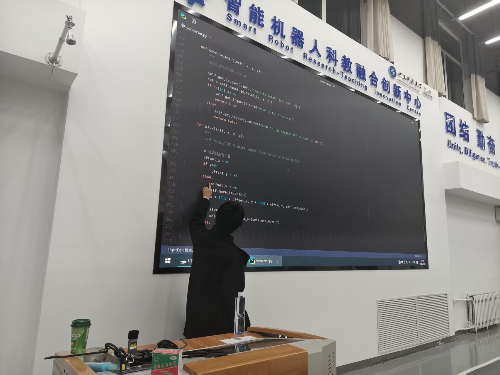 10月27日,主講團隊深入講解了機械臂抓取的基本原理及其代碼實現(xiàn)邏輯,指導(dǎo)同學(xué)們掌握代碼修改、編譯與調(diào)試技巧,并完整演示機械臂抓取過程,重點強調(diào)關(guān)鍵環(huán)節(jié)注意事項。