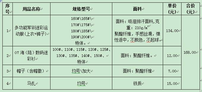 2、軍訓(xùn)用品費(fèi):每生實(shí)際應(yīng)收168元(暫收170元,應(yīng)退2元),學(xué)校統(tǒng)一招標(biāo)采購(gòu),按成本收取。包括以下內(nèi)容: