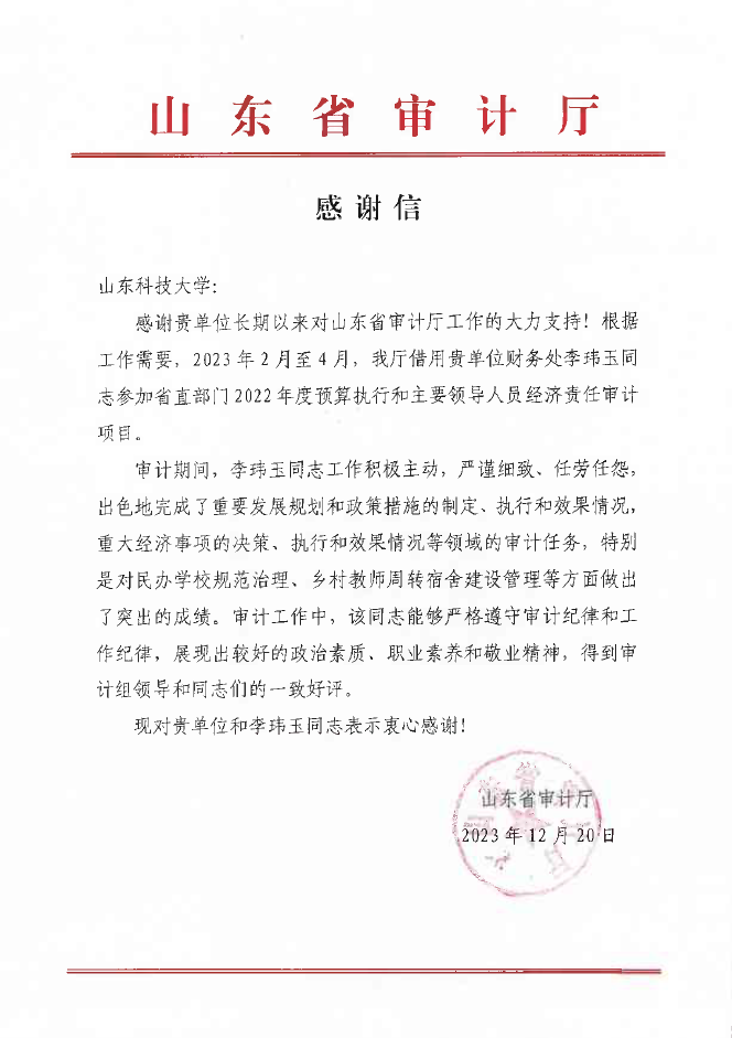 2023年,濟(jì)南校區(qū)財(cái)務(wù)部李瑋玉同志參加了山東省審計(jì)廳相關(guān)審計(jì)檢查專(zhuān)項(xiàng)活動(dòng)并圓滿完成任務(wù),上級(jí)部門(mén)對(duì)其突出表現(xiàn)給予了高度評(píng)價(jià),并給我校發(fā)來(lái)感謝信,表示對(duì)她工作的認(rèn)可和贊揚(yáng)。
