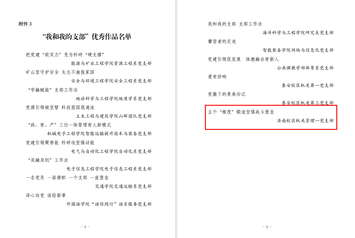 近日,校黨委組織部公布了獲獎(jiǎng)名單,由人文社科系黨支部教師蘇爽主講黨課——《大力弘揚(yáng)教育家精神 勇?lián)聲r(shí)代育人使命》、管理一黨支部報(bào)送的《五個(gè)“維度”鍛造堅(jiān)強(qiáng)戰(zhàn)斗堡壘》獲評(píng)優(yōu)秀作品。